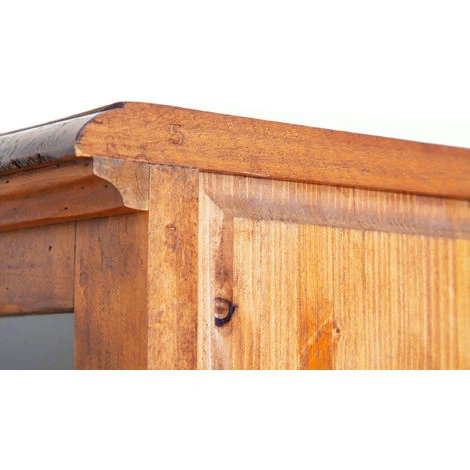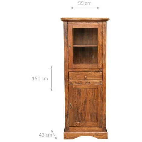 W55xDP43xH150 cm sized Country-style solid lime wood display case. Guaranteed for its solidity and durability over time wise Made in Italy craftsmanship , it boasts two practical shelves with a door closed in the lower part and two other shelves in the upper part with glass door. It also has a large central drawer made with dovetail joints and wooden knob. It adds a touch of Country charm to any living.