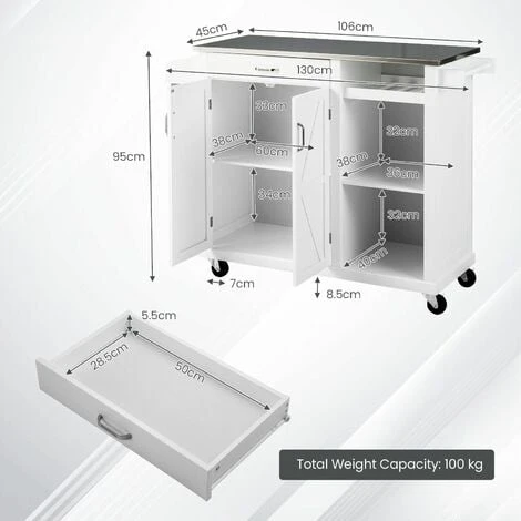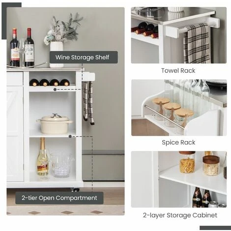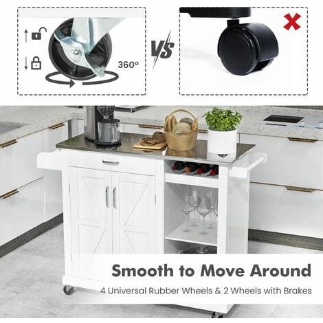 With 4 universal wheels, this kitchen island allows you to move it to the desired place without hassle. And then, lock 2 wheels to keep it in position. After that, the large countertop, spice rack, towel rack, drawer, wine storage shelf, 2-tier open compartment and 2-layer storage cabinet can’t wait to provide you with large storage space, making your items well organized. Likewise, storage shelf inside the door cabinet can be adjusted into 3 different heights for your different storage needs. What’s more, the countertop is made of premium stainless steel that is stable to hold small home appliances while allowing you to clean it with ease.