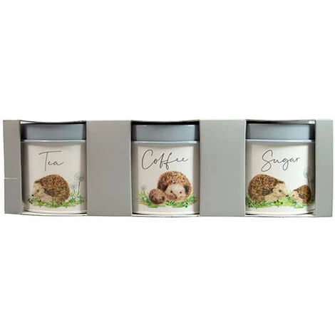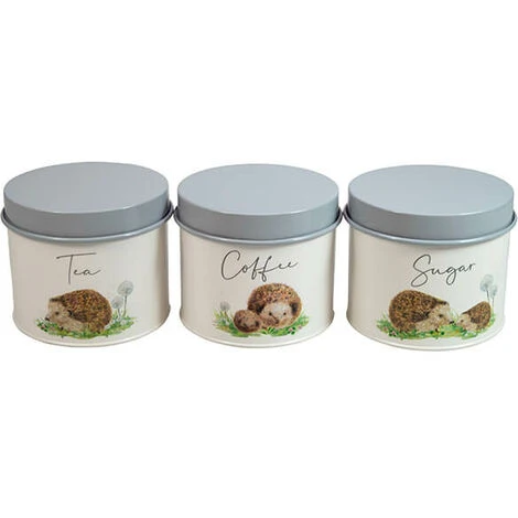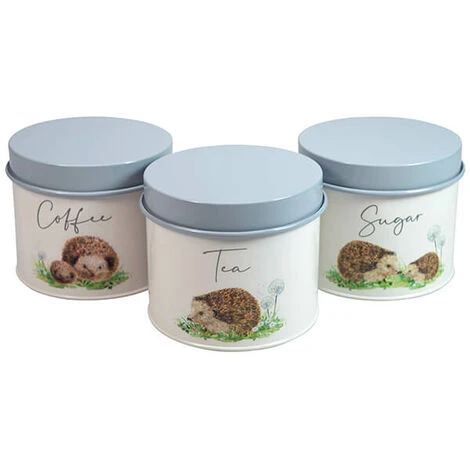 Keep tea, coffee and sugar neat and tidy in this Hedgehugs Storage Tin Set. Each tin is clearly labelled with Tea, Coffee and Sugar and is adorned with delightful illustrations of hedgehogs. A contrasting lid sits atop each canister to keep its contents fresh.