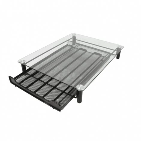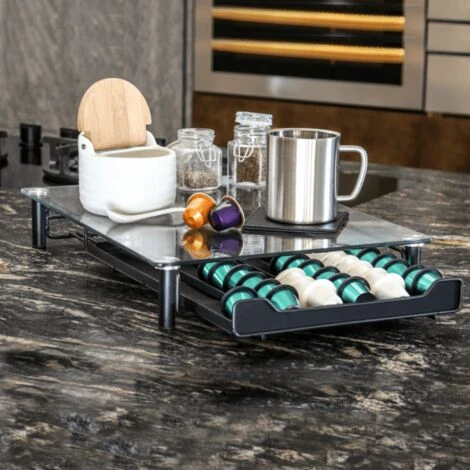 Coffee Pod Storage: Fed up rummaging through a bowl full of coffee pods to find that capsule you’re looking for? This fantastic coffee pod holder with glass top & slide out drawer is the perfect kitchen accessory for decluttering your pods. The 6 sections allow you to easily separate the different flavours which means you’ll be able to find your favourite pod in no time. Its compact style keeps your coffee pods easily accessible for those early morning coffees whilst keeping your kitchen tidy. Sleek Design: Fed up rummaging through a bowl full of coffee pods to find that capsule you’re looking for? This fantastic coffee pod holder with glass top & slide out drawer is the perfect kitchen accessory for decluttering your pods. The 6 sections allow you to easily separate the different flavours which means you’ll be able to find your favourite pod in no time. Its compact style keeps your coffee pods easily accessible for those early morning coffees whilst keeping your kitchen tidy. Up to 60 Pods: The drawer is compatible with Nespresso Pods and can hold up to 60 coffee capsules. Due to its glass top, you have a clear view of the different flavours and can decide which one you fancy before even having to open the drawer. The drawer is designed to slide smoothly which makes it easy to open, so you can access your favourite pods and treat yourself with a delicious coffee. Space Saving: With its tempered glass top there’s enough room to sit your coffee machine on, so you don’t have to take up any more worktop space than necessary. Featuring a clear glass top, your work surface is protected against any spillages or vibration damage if you sit your coffee machine on the drawer. If coffee spills onto the glass, cleaning it doesn’t take up much of your highly valued time, wipe the top with a wet cloth, dry it afterwards, and you’re good to go. Specifications: This striking and practical coffee pod holder is compatible with Nespresso pods and holds up to 60. Measures 40.5 x 30cm glass top and 37 x 24cm black base.