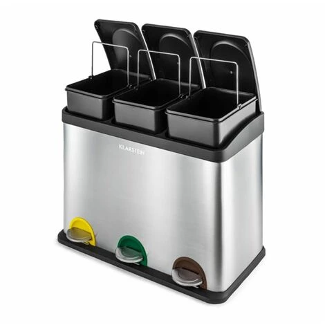 The housing of the rubbish and recycling bin is made of stainless steel and has a floor-protecting plastic base. Three removable plastic buckets with 15 litres of volume each can accommodate regular waste, organic waste, and recycling. The inserts can be quickly emptied separately from each other via a practical carrying handle.
