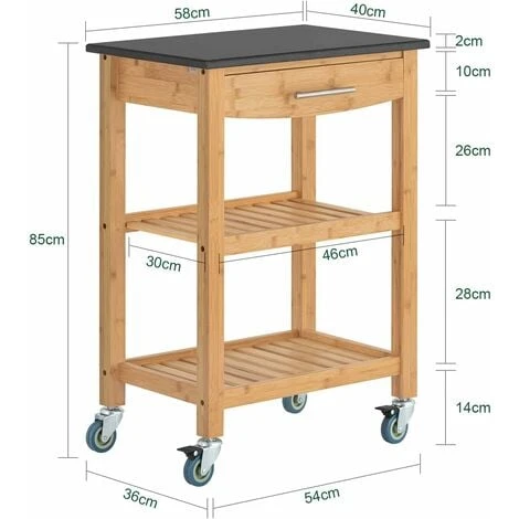 - It has granite work surface, 1 closed drawer, 2 open shelves, 4 rubber wheels and 2 with brake.