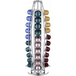 Four wired holders store up to 40 Nespresso coffee capsules. Rotates 360 degrees for easy access. The felt and scratch-resistant base protects the table or the kitchen top.