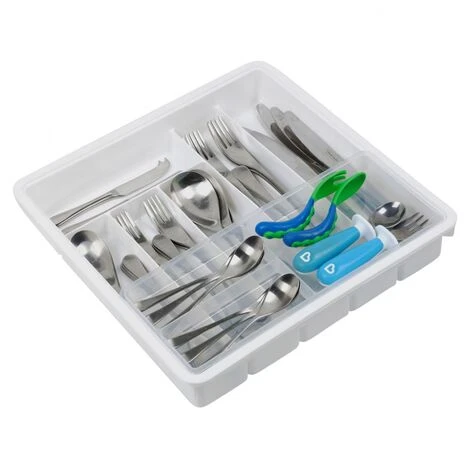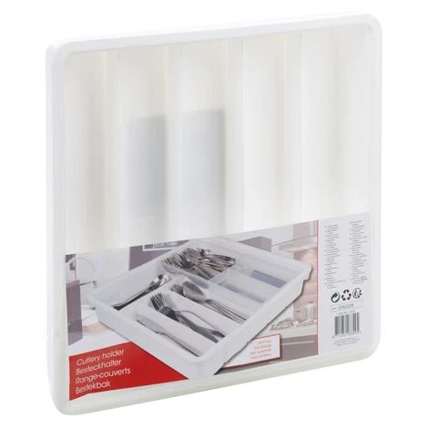 Organise your kitchen and keep it tidy with this handy and practical Cutlery Holder! The holder consists of 2 parts: The main tray with 6 compartments and the insert with 3 compartments. The main tray is suitable for storing all your regular knives, forks and spoons, whereas the insert is suitable for small items such as teaspoons.