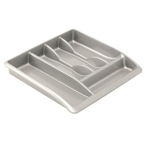 This Addis Cutlery Tray features an easy to clean, high-gloss finish and scooped compartments for easy access to contents. Use as stand-alone storage or in-drawer for organised cutlery. This cutlery tray measures W385 x D400 x H55mm and comes in a metallic silver finish.